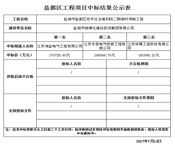 鹽城市鹽都區(qū)老年社會(huì)福利院二期臨時(shí)用電工程中標(biāo)結(jié)果公示