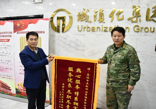 3月23日,鹽都區(qū)人民武裝部政委劉春陽(yáng)一行來我集團(tuán)贈(zèng)送錦旗,充分肯定了集團(tuán)的物業(yè)管理工作,對(duì)集團(tuán)給予的傾心服務(wù)和大力支持表示衷心的感謝。集團(tuán)黨委書記、董事長(zhǎng)倪才春參加贈(zèng)旗儀式。