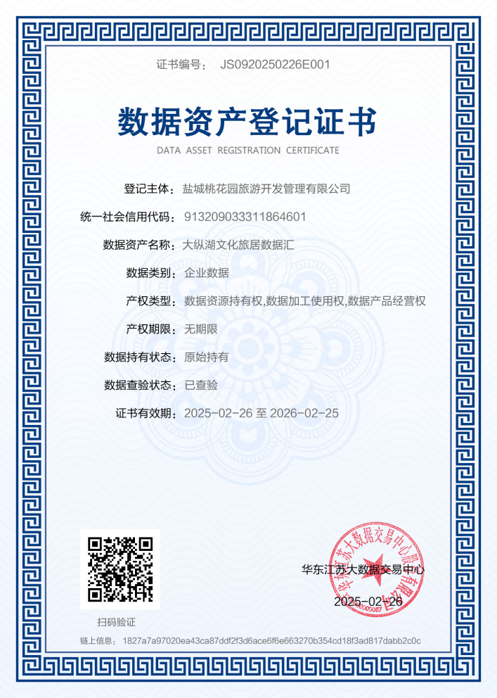 江蘇大縱湖文旅發(fā)展集團有限公司子公司鹽城桃花園旅游開發(fā)管理有限公司,依托桃花源景區(qū)豐富的文旅數(shù)據(jù)資源完成“大縱湖文化旅居數(shù)據(jù)匯”文旅數(shù)據(jù)資產(chǎn)入表,這是全市首筆國有企業(yè)文旅數(shù)據(jù)資產(chǎn)入表落地案例。