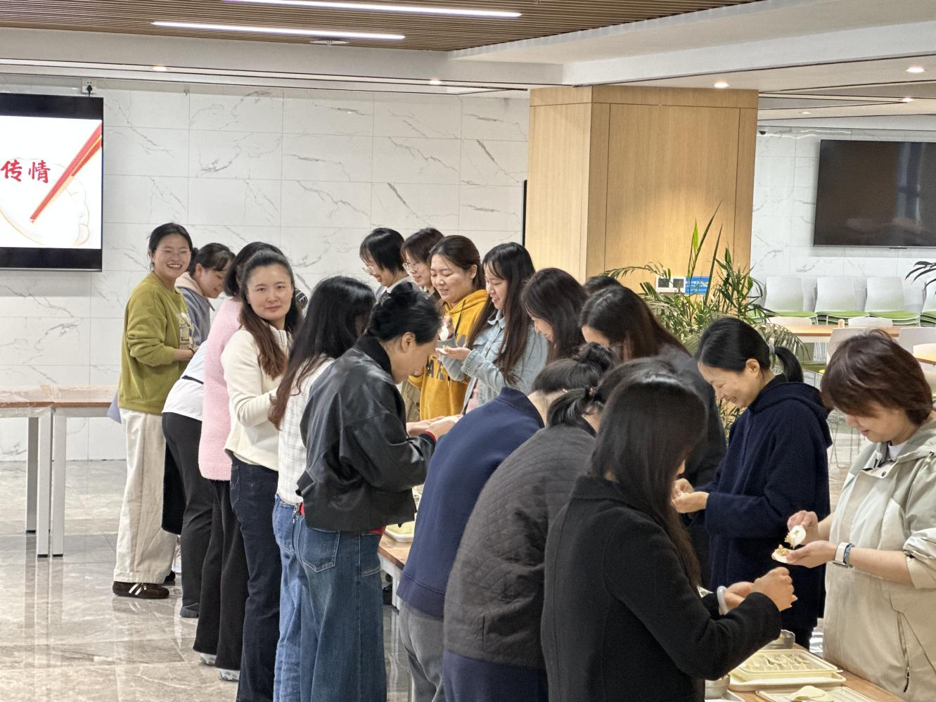 活動(dòng)現(xiàn)場(chǎng)熱鬧非凡,為降低活動(dòng)難度、提升職工體驗(yàn)感,食堂一早備好了相關(guān)材料并讓師傅提供專門指導(dǎo)。女職工們圍    在師傅身邊,全神貫注地盯著師傅的示范動(dòng)作,隨后紛紛動(dòng)手嘗試。大家的手法也從最初的略顯生疏,逐漸變得熟練起來,一步步將餃子包形態(tài)各異的模樣。動(dòng)尾聲,一碗碗熱氣騰騰的餃子出鍋,女職工們品嘗著自己的勞動(dòng)成果,暖意在心頭蔓延。