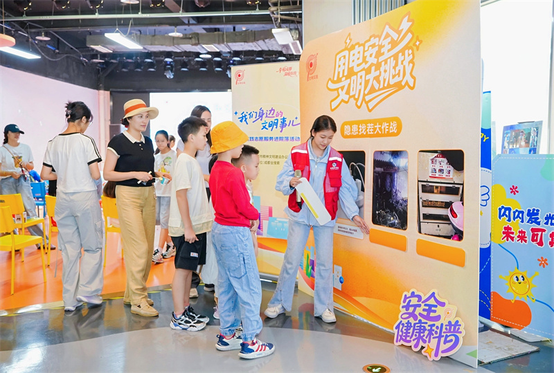 现场还设计 “用电安全・文明大挑战” 互动游戏,集趣味与科普于一体,吸引了不同年龄段的居民踊跃参与。随后,来自成华供电中心东郊记忆供电所的新时代文明实践志愿者上门为提前报名的李家沱社区居民提供免费用电隐患排查服务。在检查过程中,志愿者一边排查隐患,一边耐心向居民讲解“如何保持线路整洁”“如何规范收纳插线板”等文明用电细节。