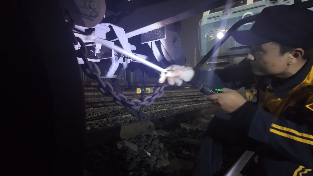 这束光的源头是一位年轻的彝族铁路职工,从他左手手电筒发出的光,在列车车厢与轨道间往来闪烁,右手的检车锤则顺着光束的方向,敲打着列车的各个重点部位。