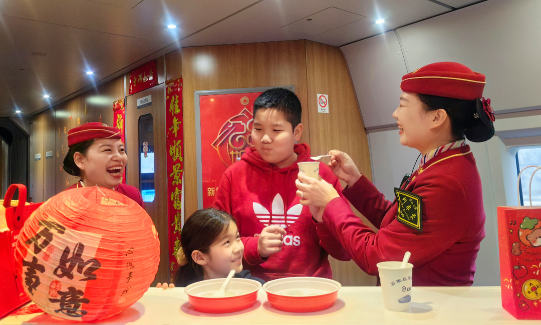 在高铁列车上吃汤圆很甜,但更甜的是大家的笑脸。